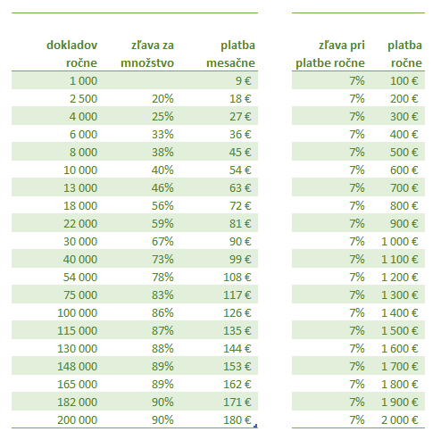 Máme klientov čo robia aj 100.000 dokladov ročne. Získajte množstevnú zľavu až do výšky 90%! Kontaktujte nás, alebo pozrite túto tabuľku pre prehľad.
